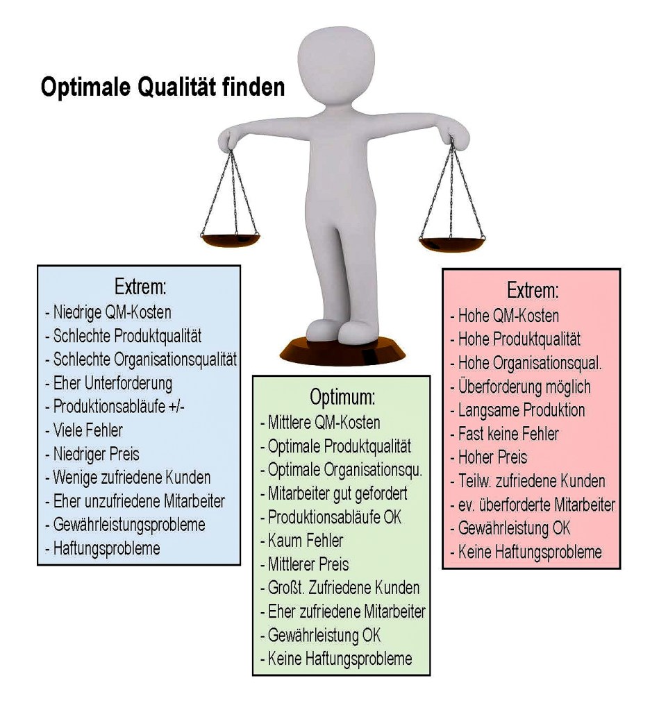 Die optimale Qualität von Organisationen, von Produkten und allen Lebensumständen richten wir zwischen den oben erwähnten Leitplanken ein. Oder sie ergibt sich einfach, wenn wir nicht an unseren Fähigkeiten, Möglichkeiten und Zielen schrauben. Die nächste Abbildung zeigt die Argumente für eine optimale Qualität zwischen den Polen einer zu niedrigen und einer zu hohen Qualität:
