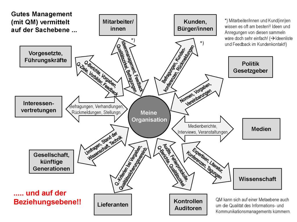 Die Qualität des Zusammenlebens und der Tätigkeiten hängen selbstverständlich von den Qualitäten der jeweils beteiligten Menschen ab. Bei - aus verschiedenen Gründen – im „Mittelpunkt“ stehenden Menschen, wie Managern (Führungskräften), spitzen sich die Qualitätsansprüche zu. Die üblichen und beinahe selbstverständlichen Qualitätsansprüche an Menschen und besonders Manager seien hier kurz erwähnt: fachliche, soziale (psychologische und soziologische) organisatorische und grundlegende mentale (Einstellungen, Temperament etc.) Kompetenzen. Dabei ist die Kommunikationsfähigkeit besonders zu erwähnen.