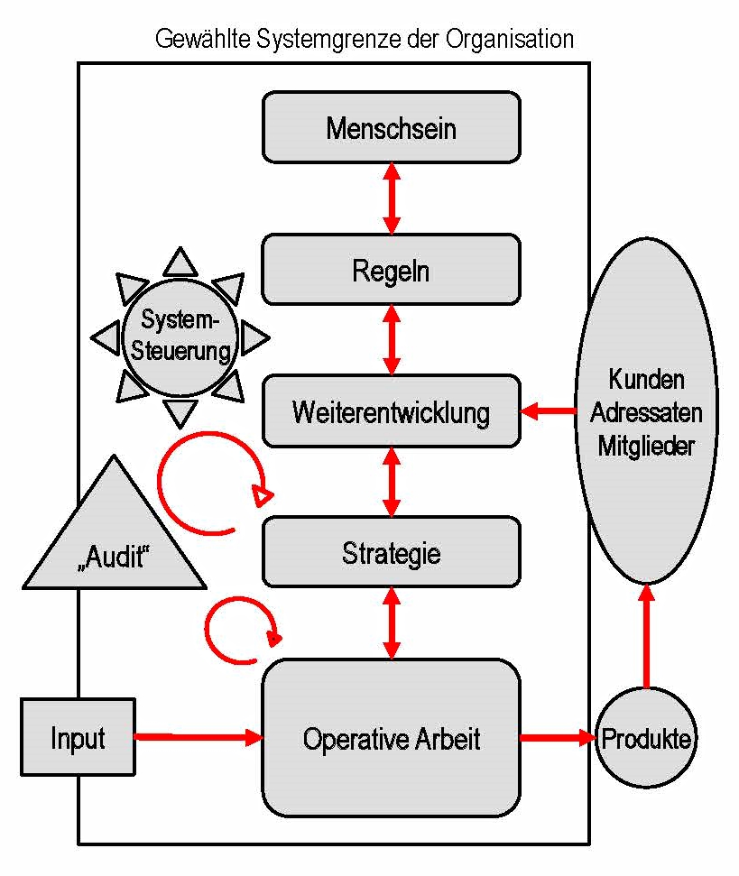 Bei Betrachtung einer Organisation leistet jeder dieser 4 Bereiche einen Beitrag zur Qualität des Organisationssystems und zur Qualität der Leistungen.