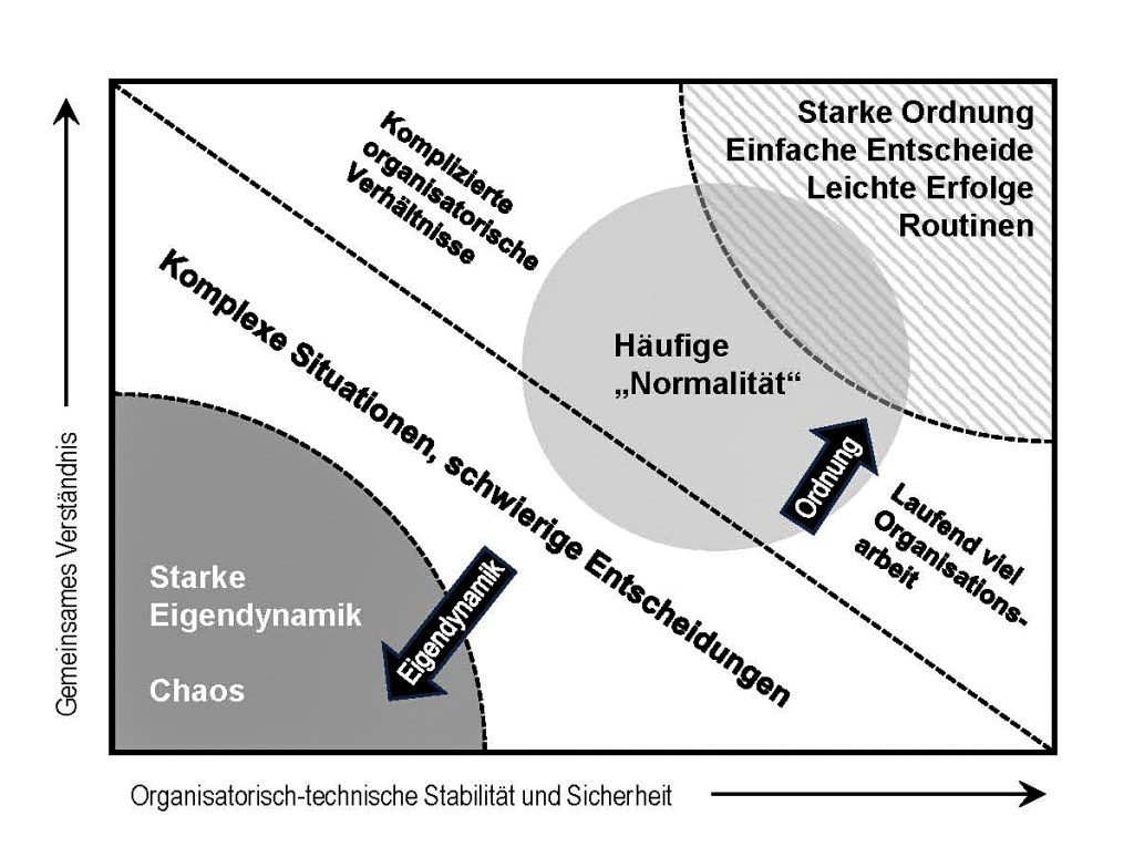 Das obige Bild wurde in ähnlicher Form und mit ähnlichen Inhalten von Ralph Douglas Stacey vor einigen Jahrzehnten entworfen (Stacey-Matrix). Die optimale Qualität und Quantität von Regeln liegt zwischen einer sehr starken Eigendynamik und einer strengen Ordnung. Das Optimum ist bei den verschiedenen Organisationen sehr verschieden. In schwierigen Situationen kommt eine Organisation automatisch mehr in den eigendynamischen und chaotischen Bereich, was durch mehr Kreativität, Innovation und Entwicklungsdynamik sehr positiv sein kann.